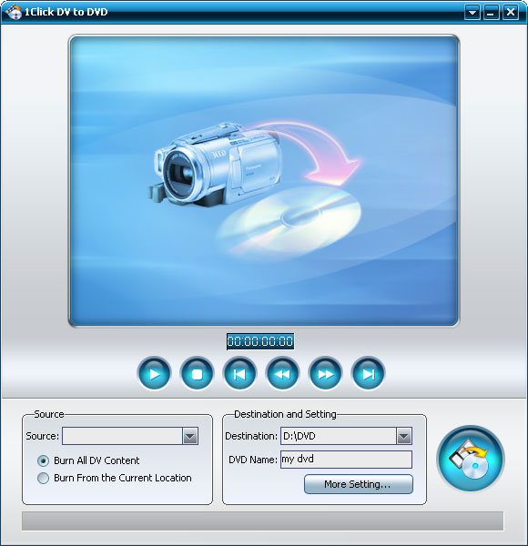1Click DV to Home DVD can convert and transfer Mini DV to DVD, DV to DVD, DV to DVD-Video disc including DVD-R, DVD+R, DVD-RW, DVD+RW, etc. just with one click. Before burning, you can choose to burn all DV content, or burn a segment of Mini DV, DV.