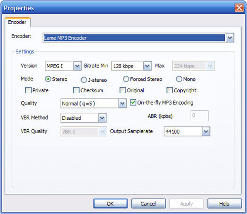 You can adjust some special settings for your conversion by clicking "Settings…" beside the "Encoder" combo-box, such as "Bit Rate" and "VBR".