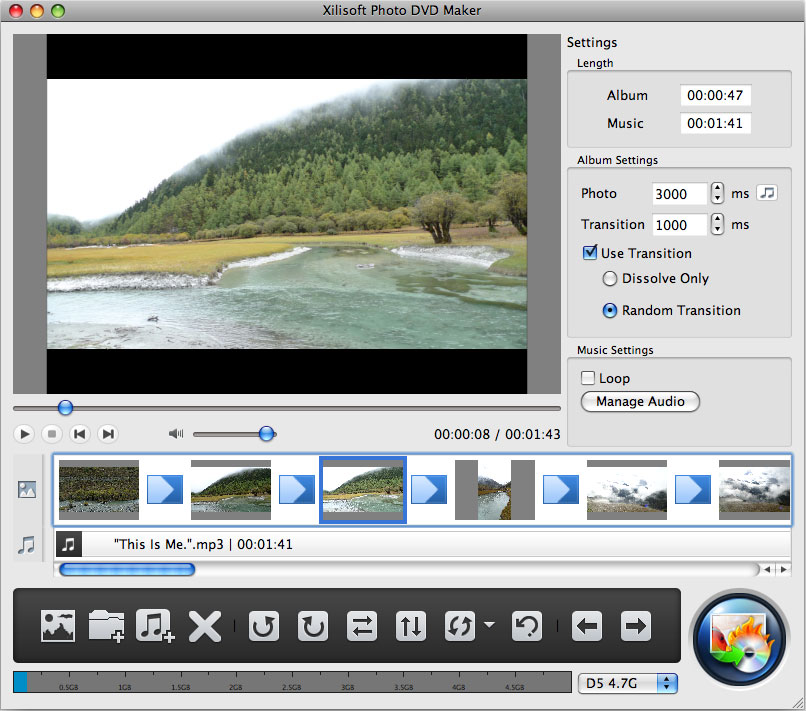 Besides a converter, Xilisoft Photo Home DVD Maker for Mac is also a Home DVD maker by which you can apply dramatic effects on your photo show, rotate and flip photos or insert beautiful audio files as background music. Xilisoft Photo Home DVD Maker for Mac can convert photos to DVDs on a surprisingly fast speed to save your time and effort significantly.