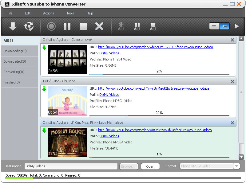 Just one click on the YouTube video, Xilisoft YouTube to iPhone Converter will download resources with considerable fast speed and successively convert them to iPhone videos/audios.