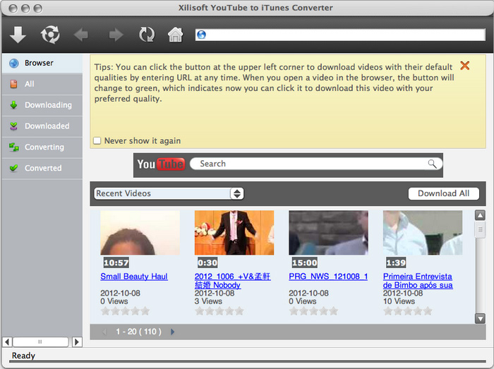 Before downloading and converting, you could first browse YouTube site in the built-in browser in this YouTube to iTunes Converter for Mac, and find and play your favorite videos. Then, you can convert YouTube videos to all formats compatible with Apple devices.